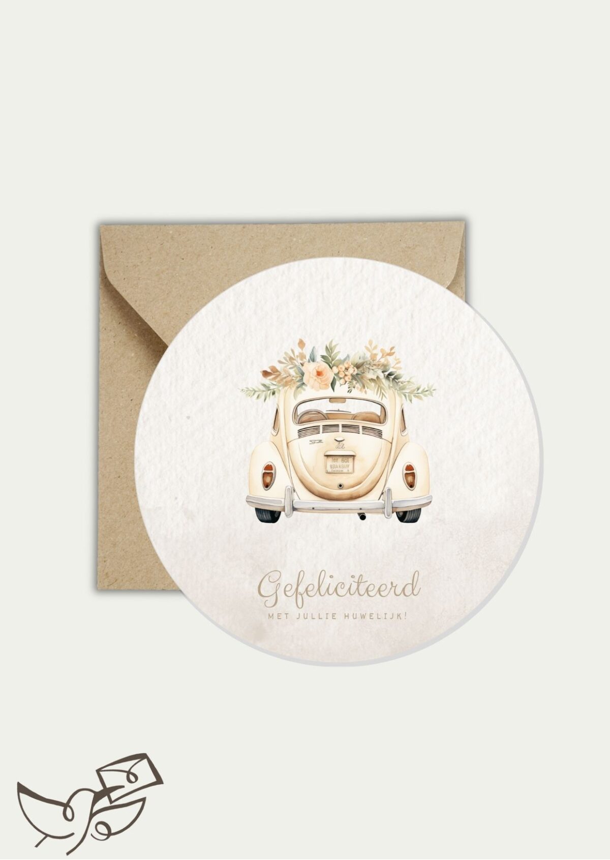 Ronde kaart gefeliciteerd met jullie huwelijk auto (nieuwe papiersoort, glad en glanzend)